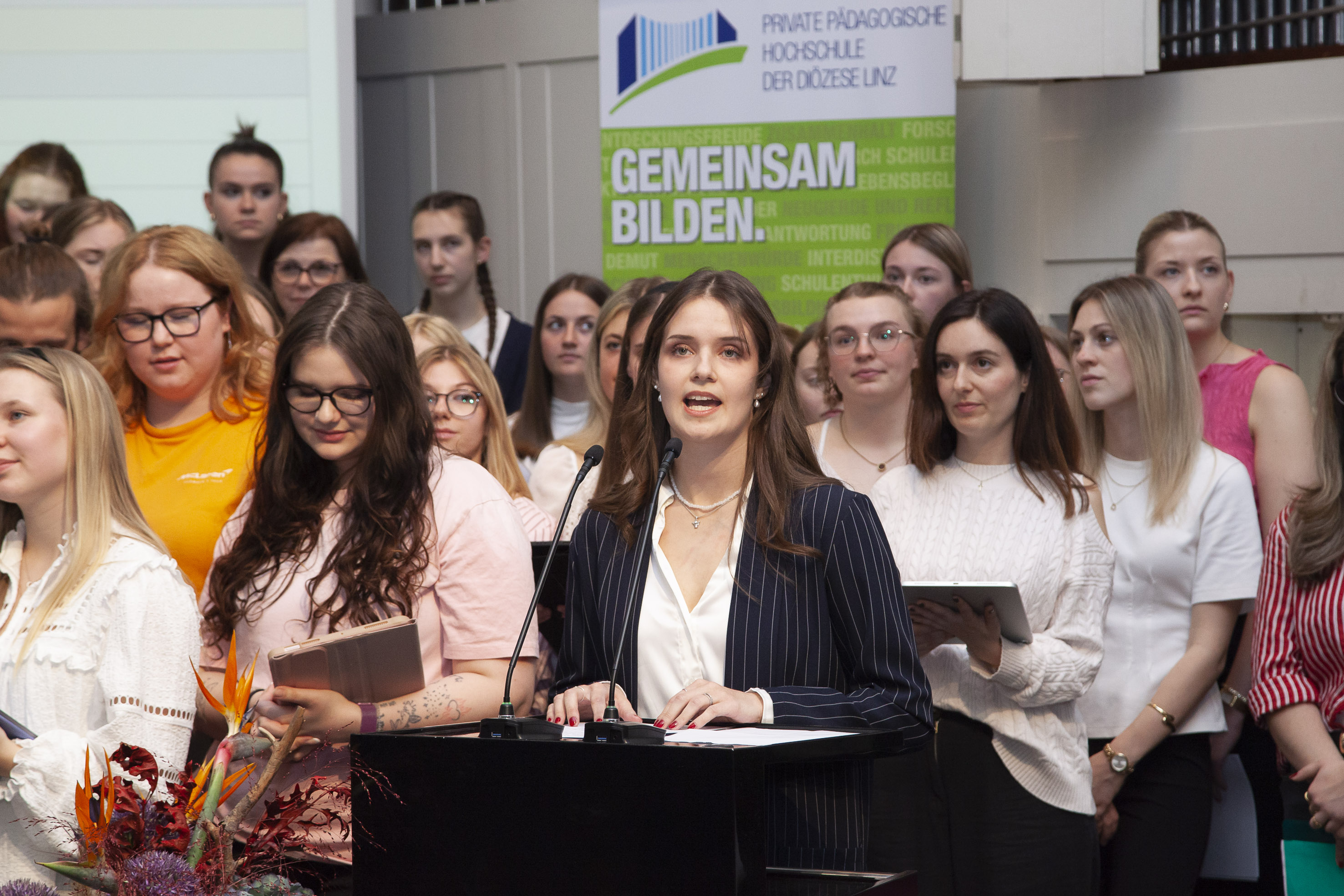 Direkt neben ihren Kommiliton:innen auf der Bühne schilderte Absolventin Barbara Stifter offen und authentisch die Herausforderungen des Studiums – besonders während der Corona-Zeit – sowie die anfänglichen Unsicherheiten im Umgang bei Begriffen wie „Beziehungsarbeit“.