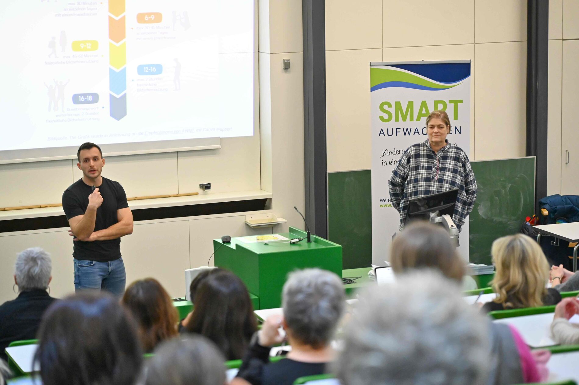 Dr. Arnika Thiede und Christoph Rosenthaler (beide KH Barmh. Brüder Linz) präsentierten gemeinsam mit dem Projektteam “SMART AUFWACHSEN” (mit Petra Traxler, Anna Weghuber, Thomas Wimmer, alle PHDL) aktuelle medizinische, entwicklungspsychologische und pädagogische Erkenntnisse – praxisnah und eindringlich.