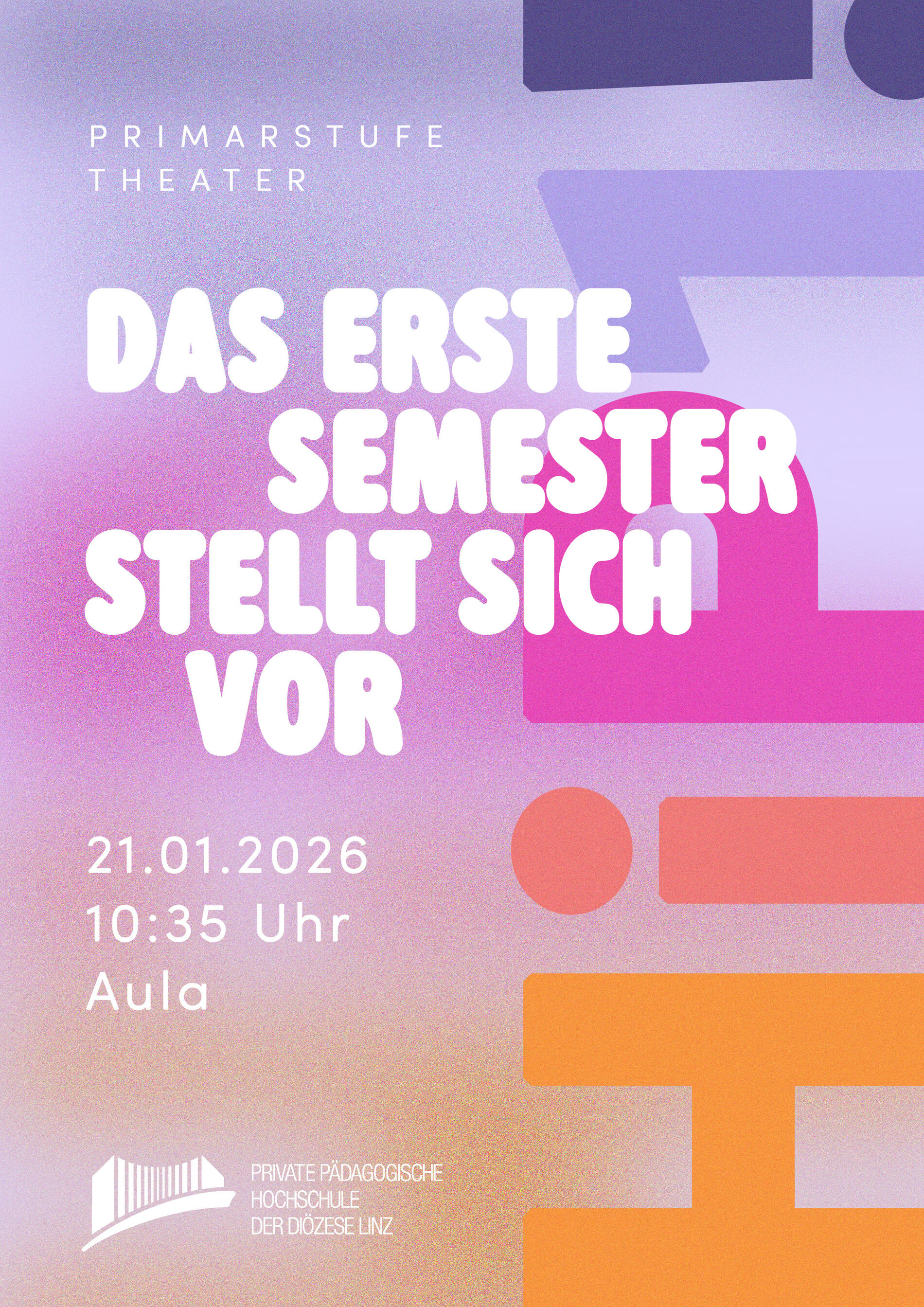 Am 21. Jänner 2026 zeigt sich das 1. Semester der Primarstufe erstmals auf der Bühne. In der AULA feiert das neue Theaterformat „HiP1!“ Premiere – entwickelt im Rahmen des Moduls Berufsfeld Schule – Berufsrolle Lehrer:in und der neuen Lehrveranstaltung Theatrale Status- und Rollenarbeit.