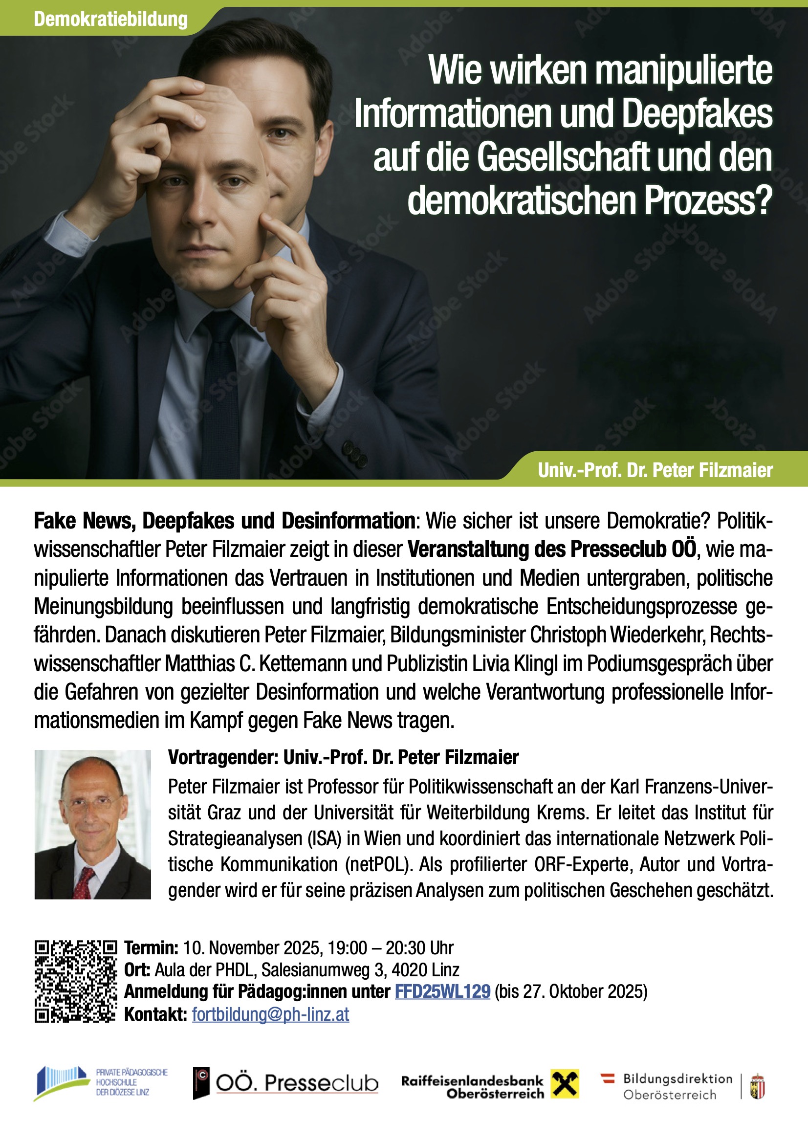 Fake News und Deepfakes: Peter Filzmaier zeigt in dieser Veranstaltung des Presseclub OÖ, wie manipulierte Informationen das Vertrauen in Institutionen und Medien untergraben, politische Meinungsbildung beeinflussen und demokratische Entscheidungsprozesse gefährden. Nähere Details entnehmen Sie bitte PH-Online bzw. aus dem Flyer.